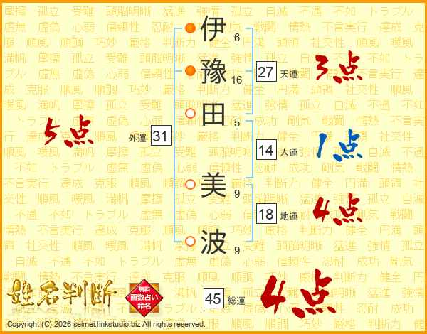伊(6画)豫(16画)田(5画) 美(9画)波(9画)