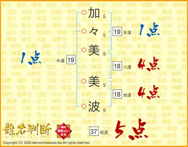 加(5画)々(5画)美(9画) 美(9画)波(9画)