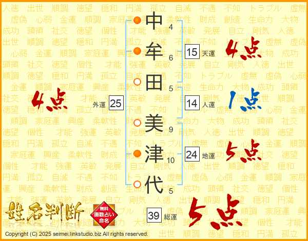 中(4画)牟(6画)田(5画) 美(9画)津(10画)代(5画)