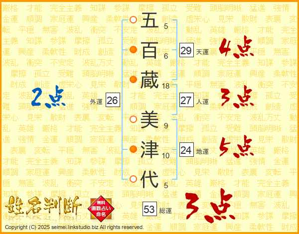 五(5画)百(6画)蔵(18画) 美(9画)津(10画)代(5画)