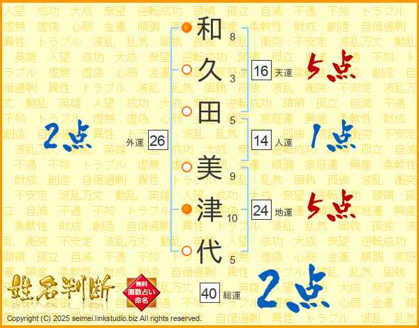 和(8画)久(3画)田(5画) 美(9画)津(10画)代(5画)
