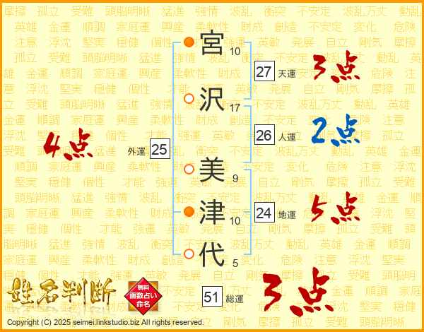 宮(10画)沢(17画) 美(9画)津(10画)代(5画)
