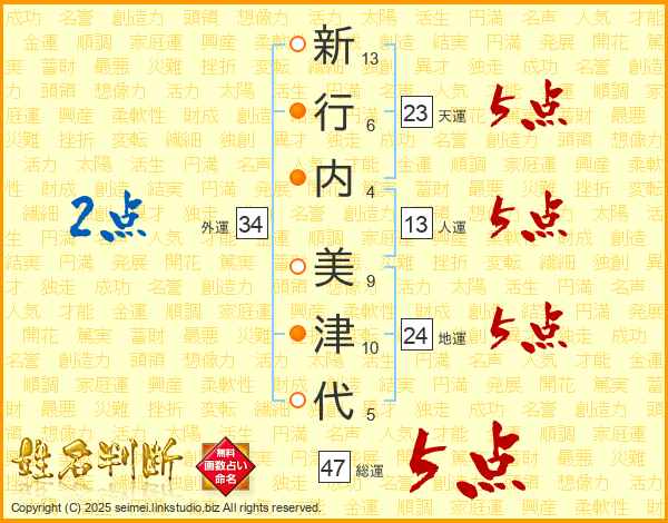 新(13画)行(6画)内(4画) 美(9画)津(10画)代(5画)