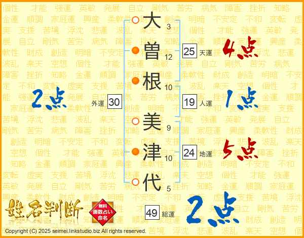 大(3画)曽(12画)根(10画) 美(9画)津(10画)代(5画)