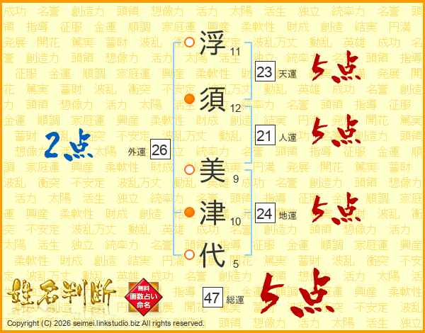 浮(11画)須(12画) 美(9画)津(10画)代(5画)