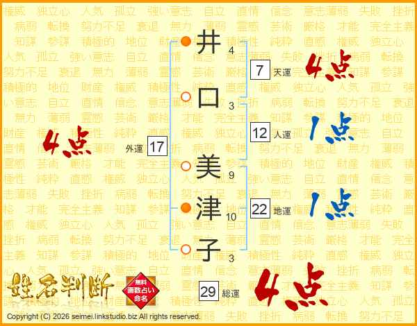 井(4画)口(3画) 美(9画)津(10画)子(3画)