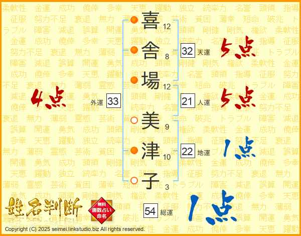 喜(12画)舎(8画)場(12画) 美(9画)津(10画)子(3画)