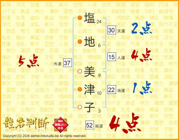 塩(24画)地(6画) 美(9画)津(10画)子(3画)