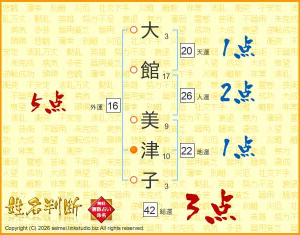 大(3画)館(17画) 美(9画)津(10画)子(3画)