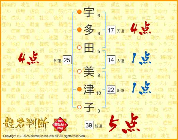 宇(6画)多(6画)田(5画) 美(9画)津(10画)子(3画)