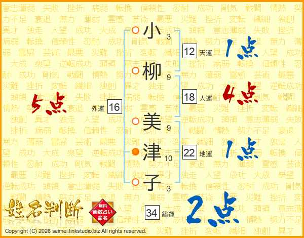 小(3画)柳(9画) 美(9画)津(10画)子(3画)