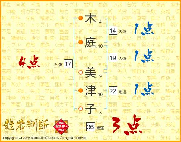 木(4画)庭(10画) 美(9画)津(10画)子(3画)