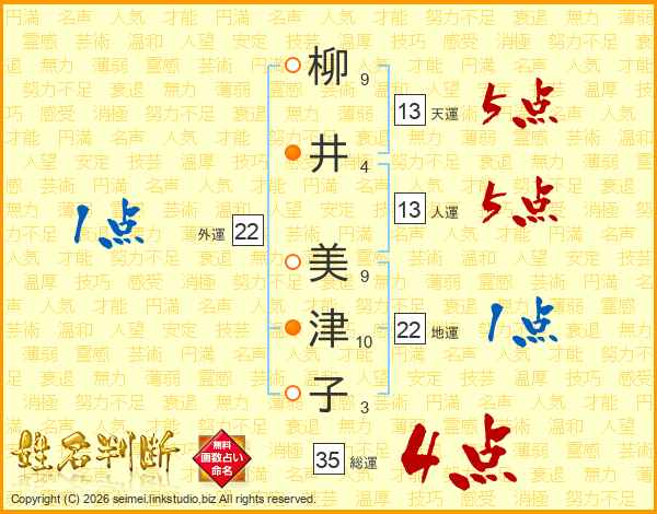 柳(9画)井(4画) 美(9画)津(10画)子(3画)