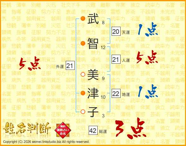 武(8画)智(12画) 美(9画)津(10画)子(3画)