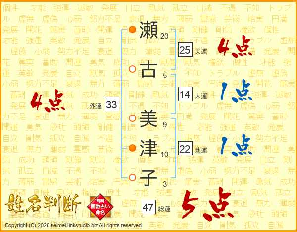 瀬(20画)古(5画) 美(9画)津(10画)子(3画)