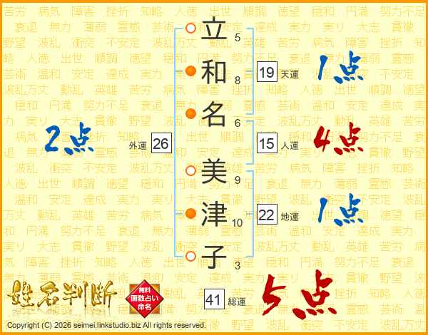 立(5画)和(8画)名(6画) 美(9画)津(10画)子(3画)