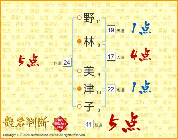 野(11画)林(8画) 美(9画)津(10画)子(3画)