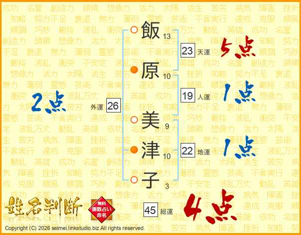 飯(13画)原(10画) 美(9画)津(10画)子(3画)
