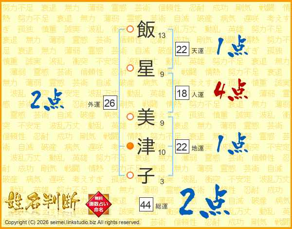 飯(13画)星(9画) 美(9画)津(10画)子(3画)