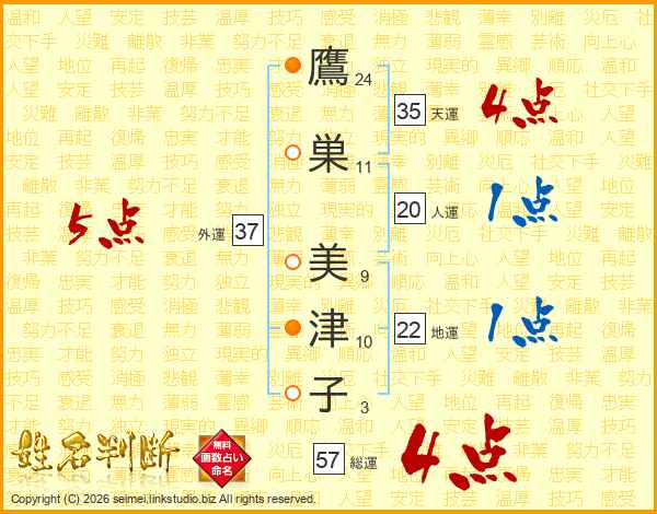 鷹(24画)巣(11画) 美(9画)津(10画)子(3画)