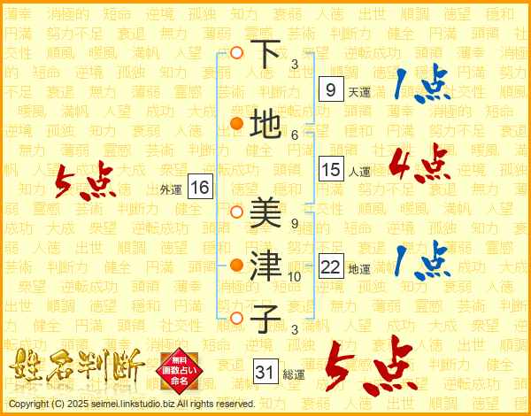 下(3画)地(6画) 美(9画)津(10画)子(3画)