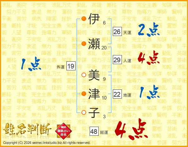 伊(6画)瀬(20画) 美(9画)津(10画)子(3画)