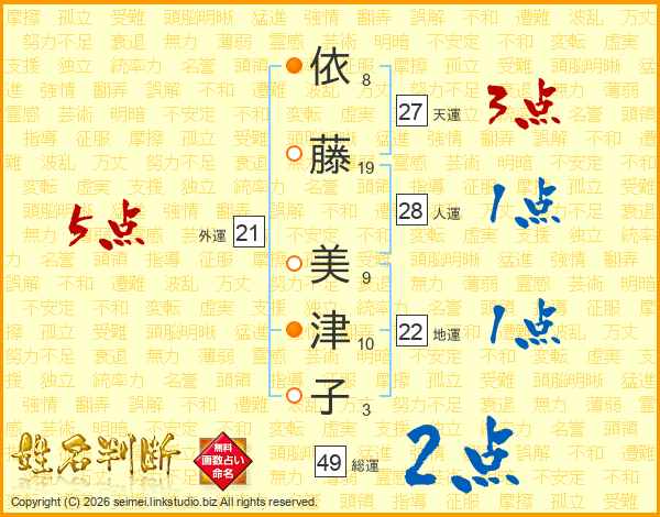 依(8画)藤(19画) 美(9画)津(10画)子(3画)
