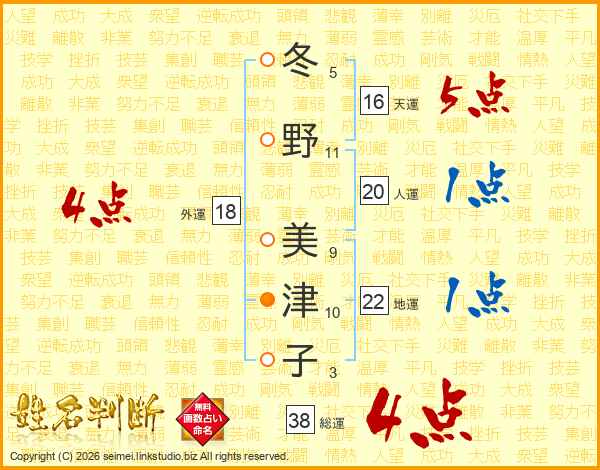 冬野美津子さんの総運は38画の4点!
