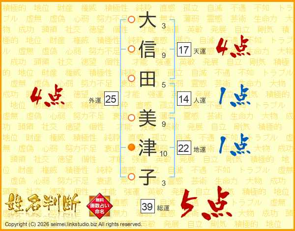 大(3画)信(9画)田(5画) 美(9画)津(10画)子(3画)