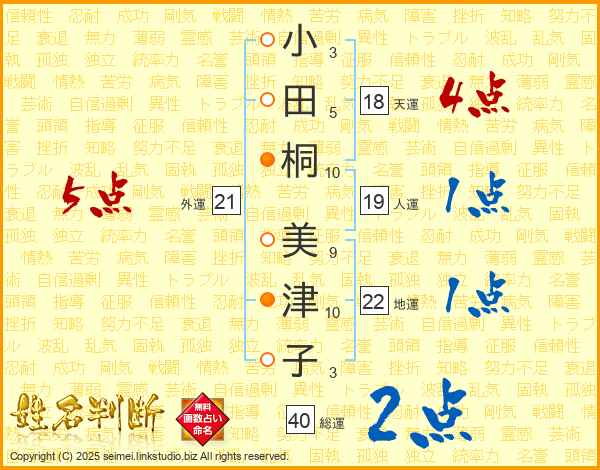 小(3画)田(5画)桐(10画) 美(9画)津(10画)子(3画)