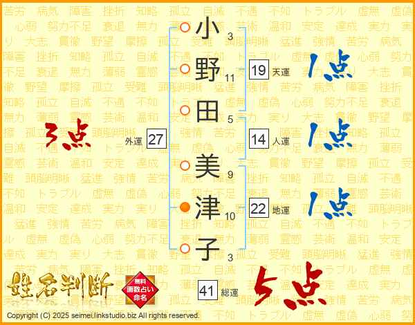 小(3画)野(11画)田(5画) 美(9画)津(10画)子(3画)
