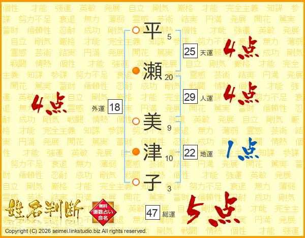 平(5画)瀬(20画) 美(9画)津(10画)子(3画)