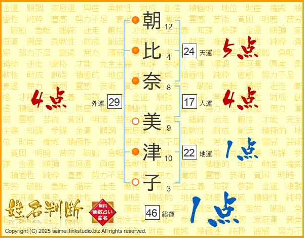 朝(12画)比(4画)奈(8画) 美(9画)津(10画)子(3画)