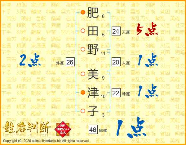 肥(8画)田(5画)野(11画) 美(9画)津(10画)子(3画)