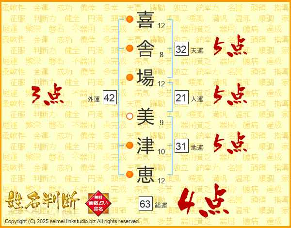 喜(12画)舎(8画)場(12画) 美(9画)津(10画)恵(12画)