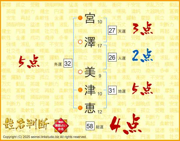 宮(10画)澤(17画) 美(9画)津(10画)恵(12画)