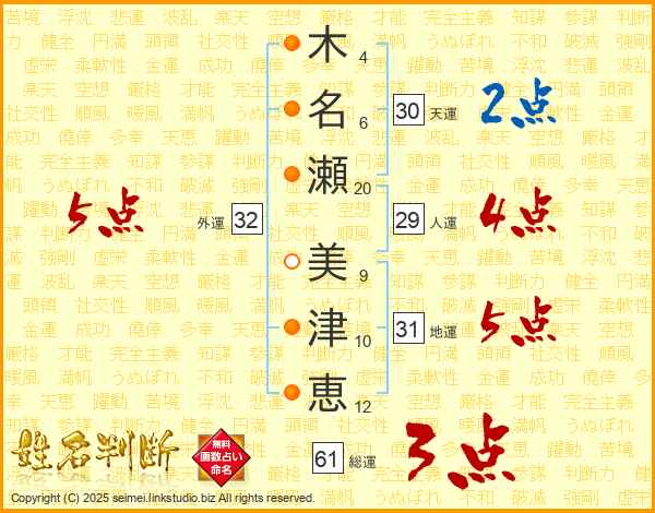 木(4画)名(6画)瀬(20画) 美(9画)津(10画)恵(12画)