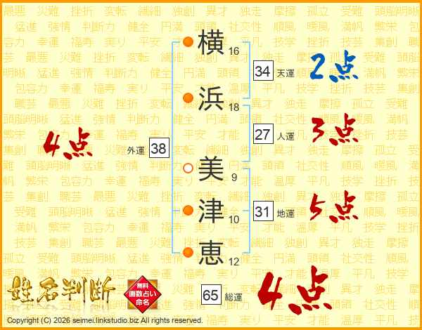 横(16画)浜(18画) 美(9画)津(10画)恵(12画)