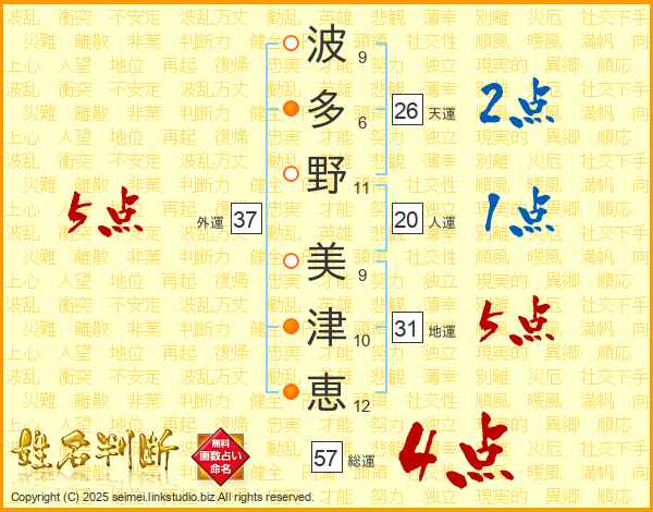 波(9画)多(6画)野(11画) 美(9画)津(10画)恵(12画)