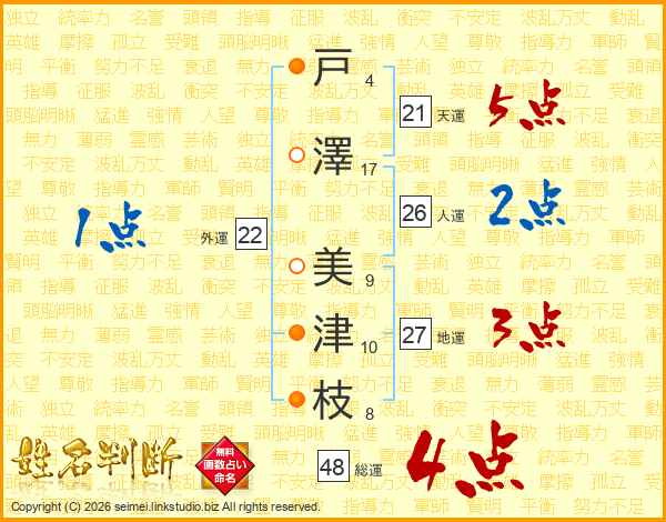 戸(4画)澤(17画) 美(9画)津(10画)枝(8画)