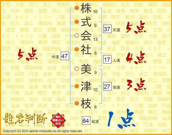 株(10画)式(6画)会(13画)社(8画) 美(9画)津(10画)枝(8画)