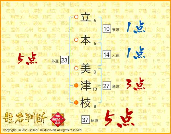 立(5画)本(5画) 美(9画)津(10画)枝(8画)