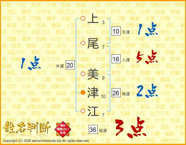 上(3画)尾(7画) 美(9画)津(10画)江(7画)