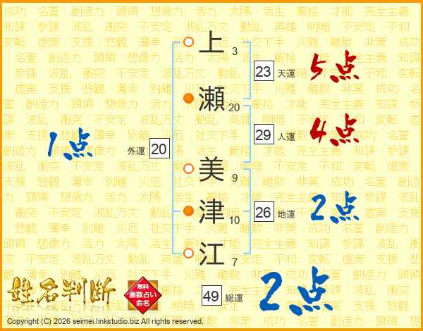 上(3画)瀬(20画) 美(9画)津(10画)江(7画)