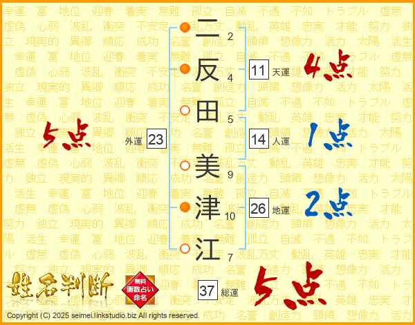 生活面を象徴する運勢です。外部から受ける影響力を表し、結婚運、家庭運や職場、環境への順応性を表します。総運から人運を引いた画数。姓や名が1文字の場合を除く。