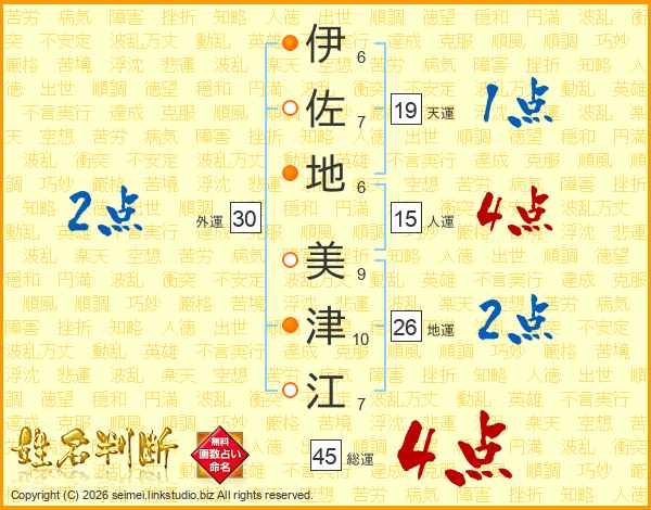 伊(6画)佐(7画)地(6画) 美(9画)津(10画)江(7画)