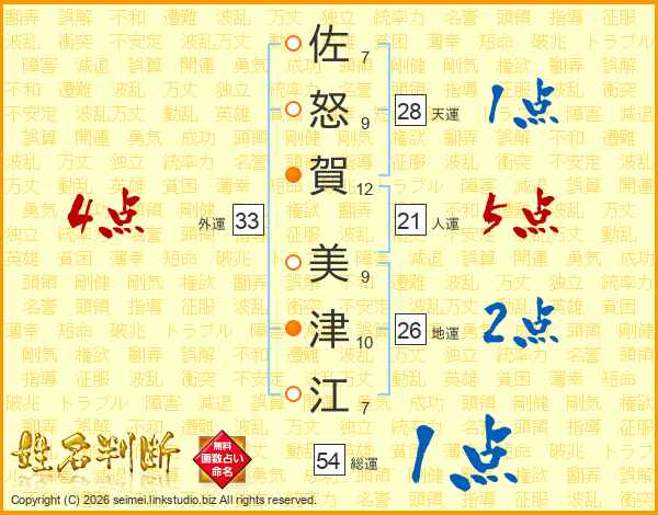 佐(7画)怒(9画)賀(12画) 美(9画)津(10画)江(7画)