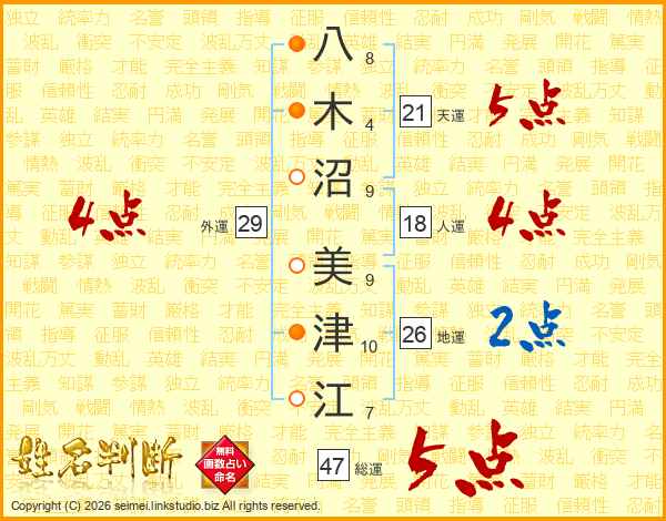 八(8画)木(4画)沼(9画) 美(9画)津(10画)江(7画)