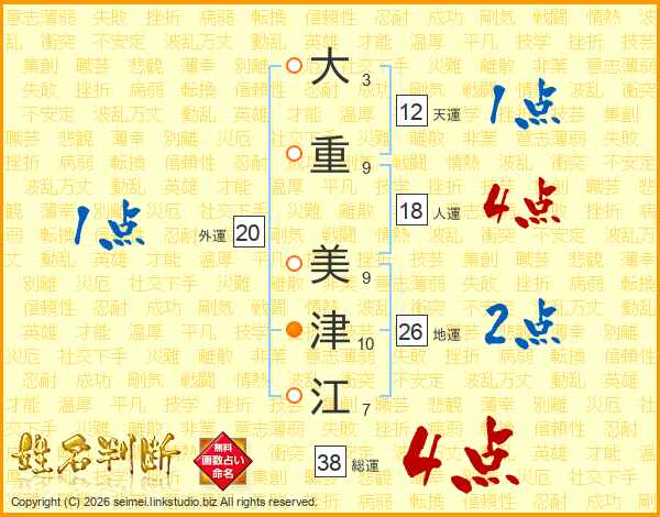 大(3画)重(9画) 美(9画)津(10画)江(7画)