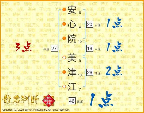 安(6画)心(4画)院(10画) 美(9画)津(10画)江(7画)